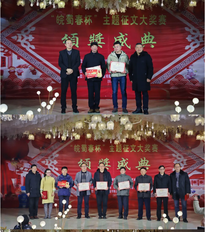 1月8日,由宿松縣文聯、宿松縣融媒體、宿松縣市場監督管理(lǐ)局共同舉辦的(de)皖蜀春杯征文頒獎盛典在皖蜀春酒業宴會廳隆重舉行。